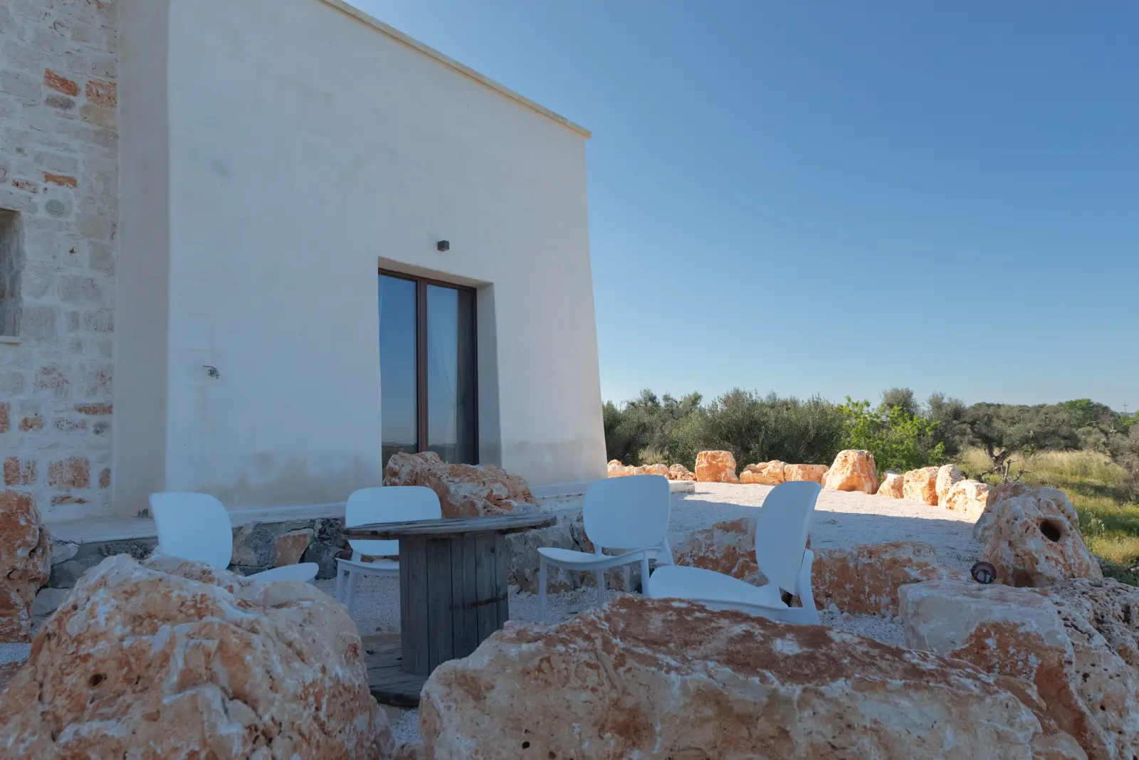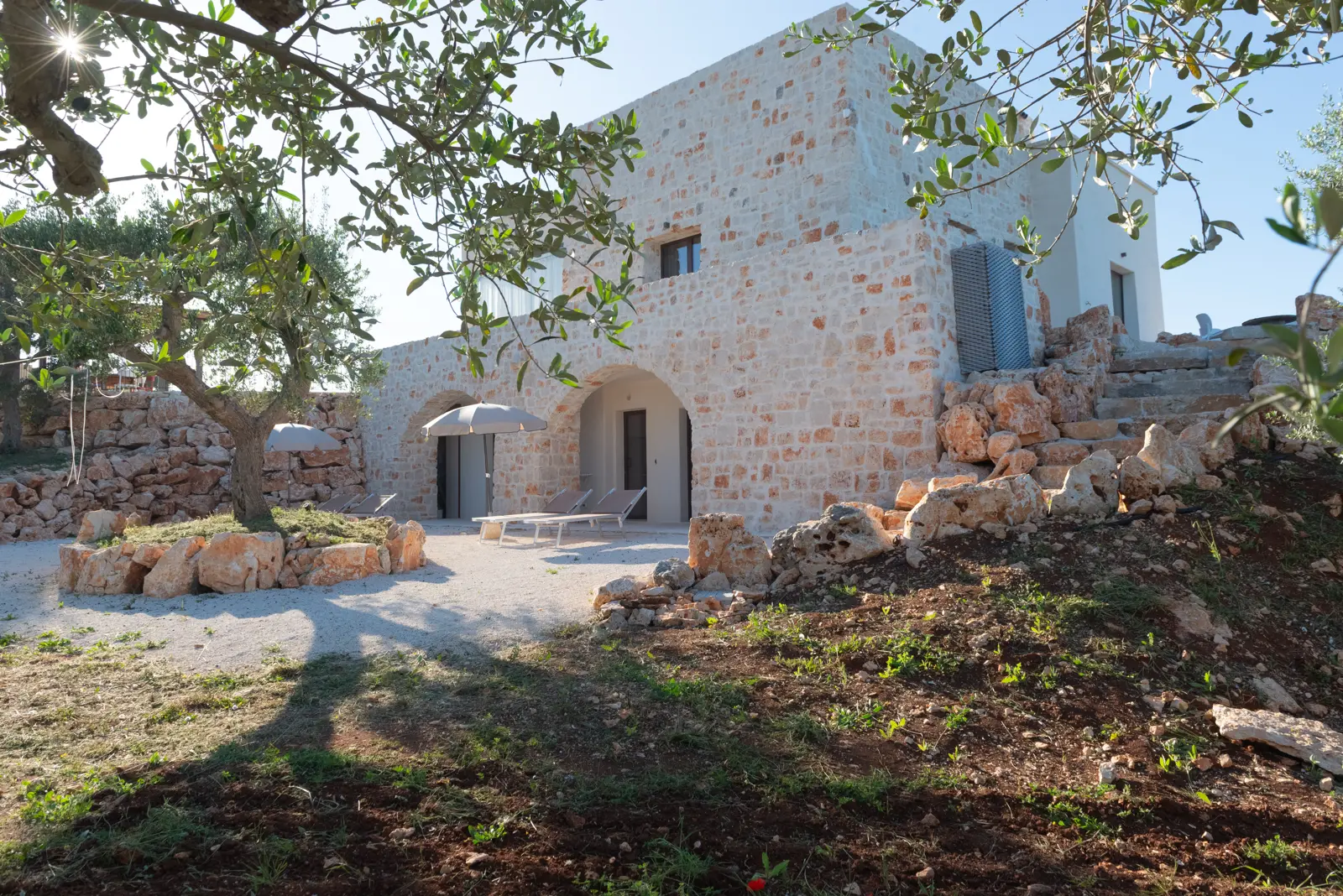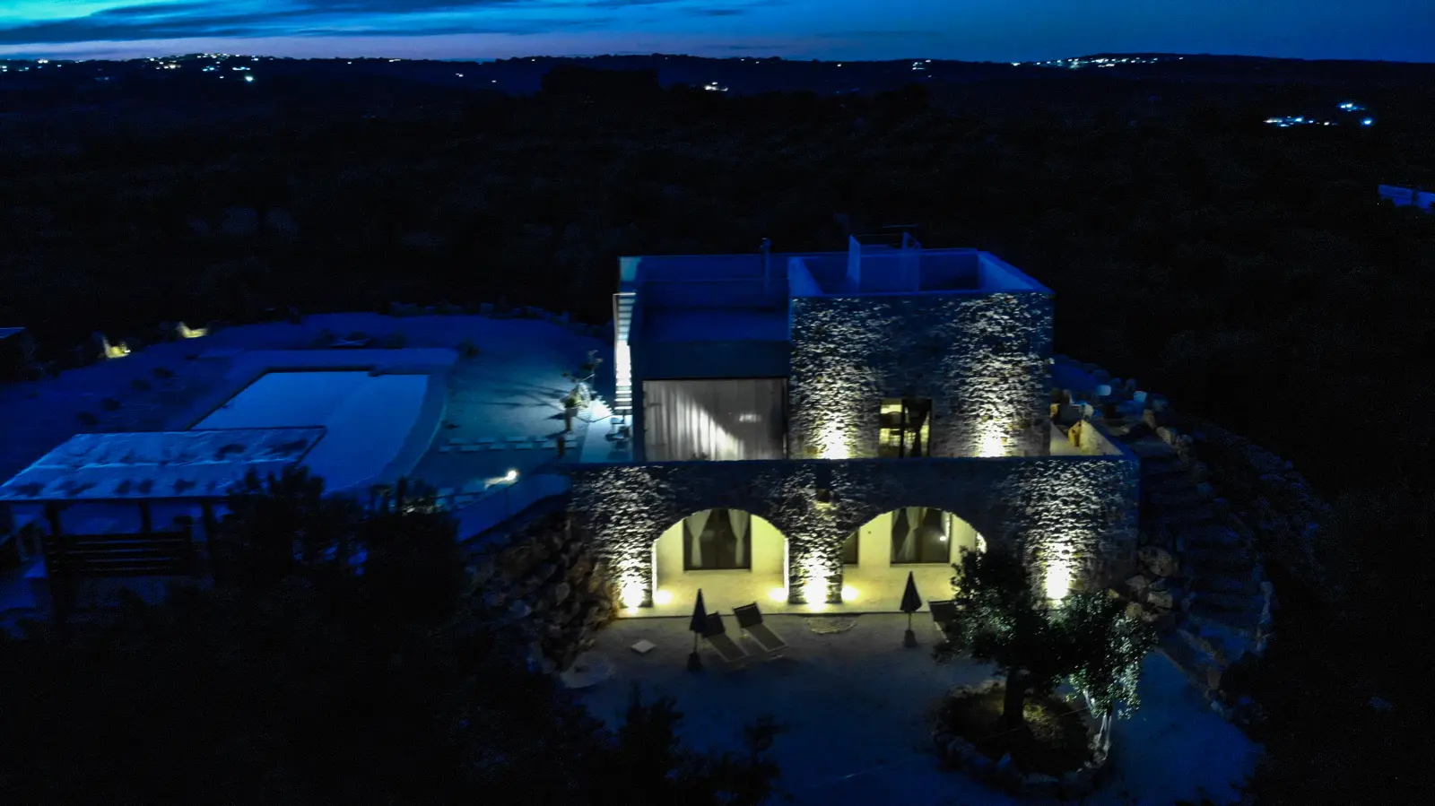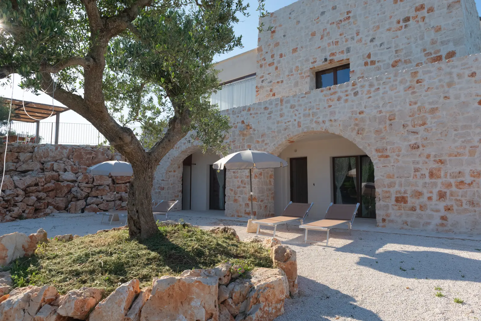 La posizione dominante e la realizzazione della struttura con colori e materiali locali di pietra calcarea, fanno da piacevole contrasto alla terra rossa del territorio ed al verde che la circonda e godere della vista del sole dall’alba e al tramonto.