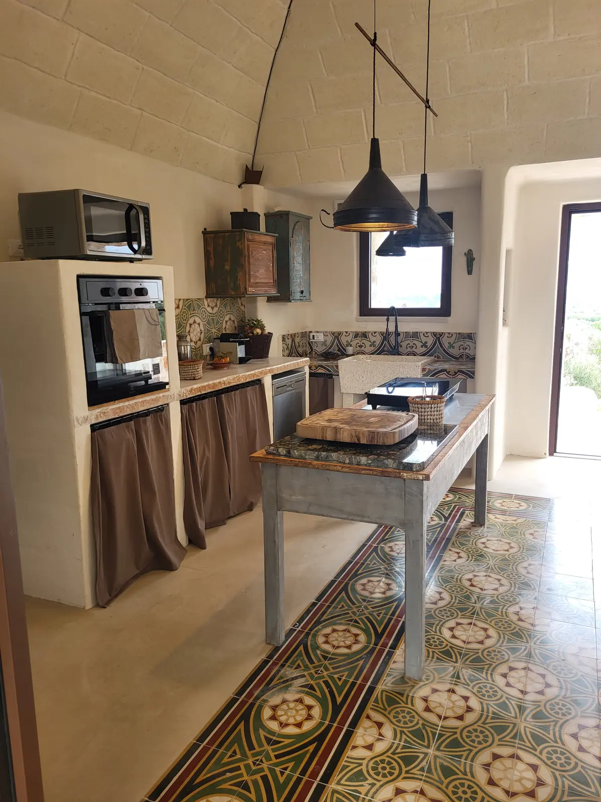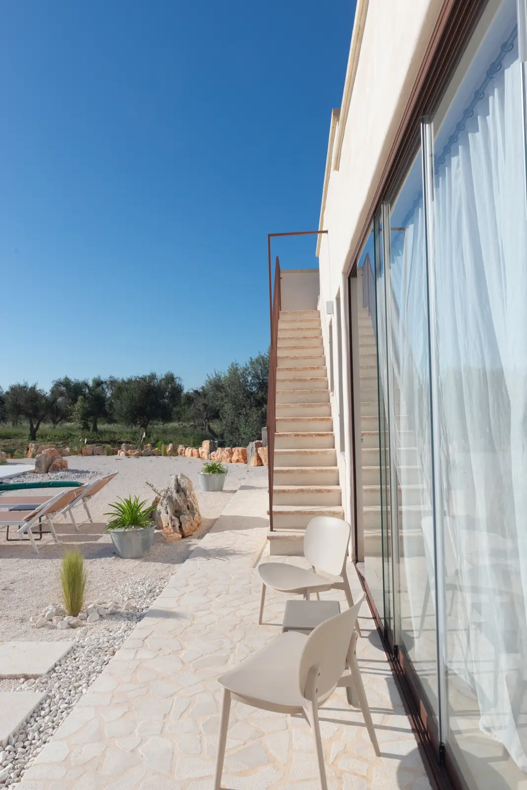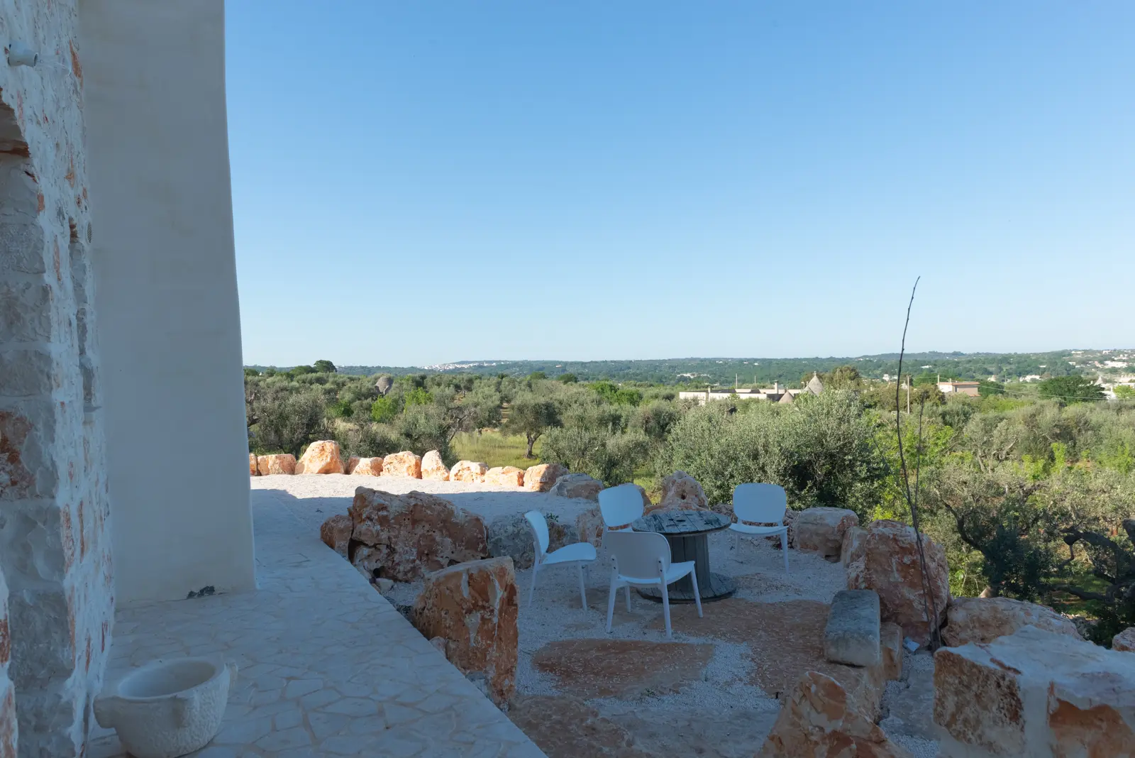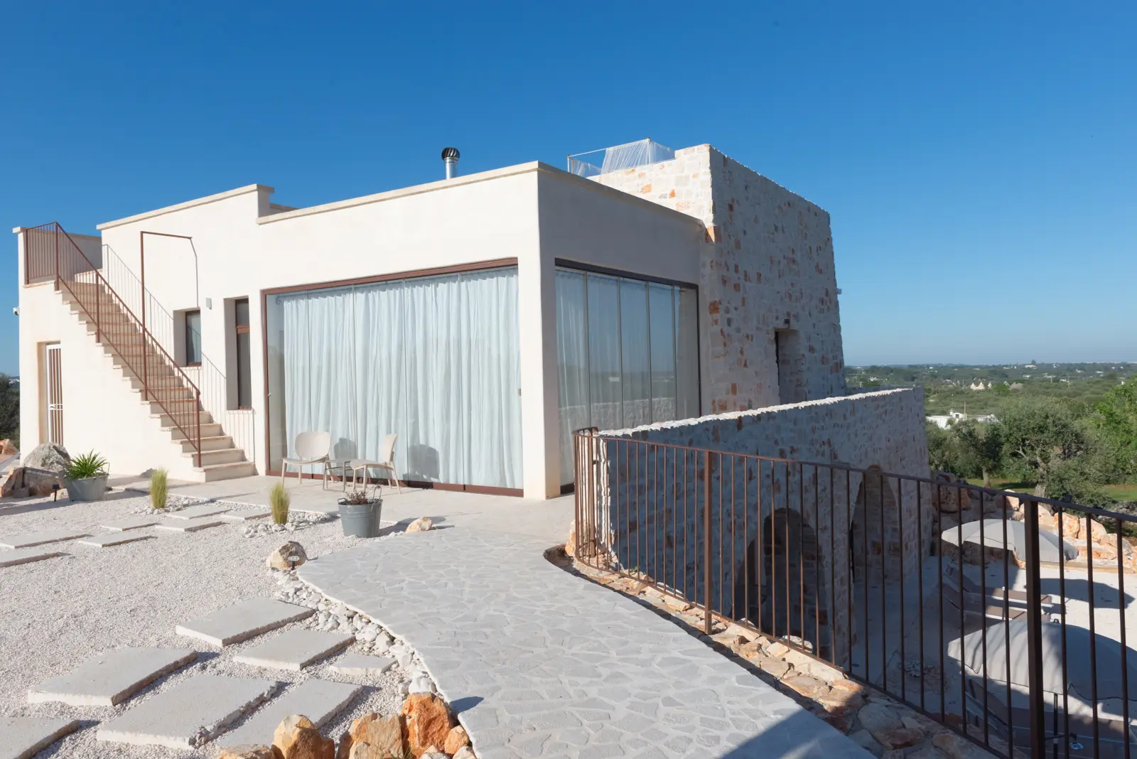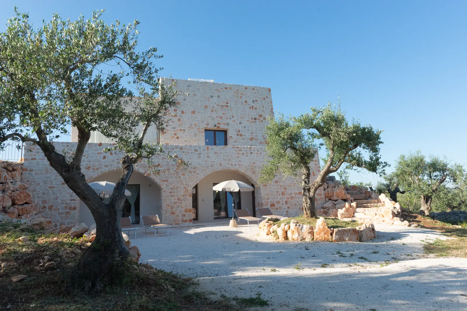 La posizione dominante e la realizzazione della struttura con colori e materiali locali di pietra calcarea, fanno da piacevole contrasto alla terra rossa del territorio ed al verde che la circonda e godere della vista del sole dall’alba e al tramonto.
