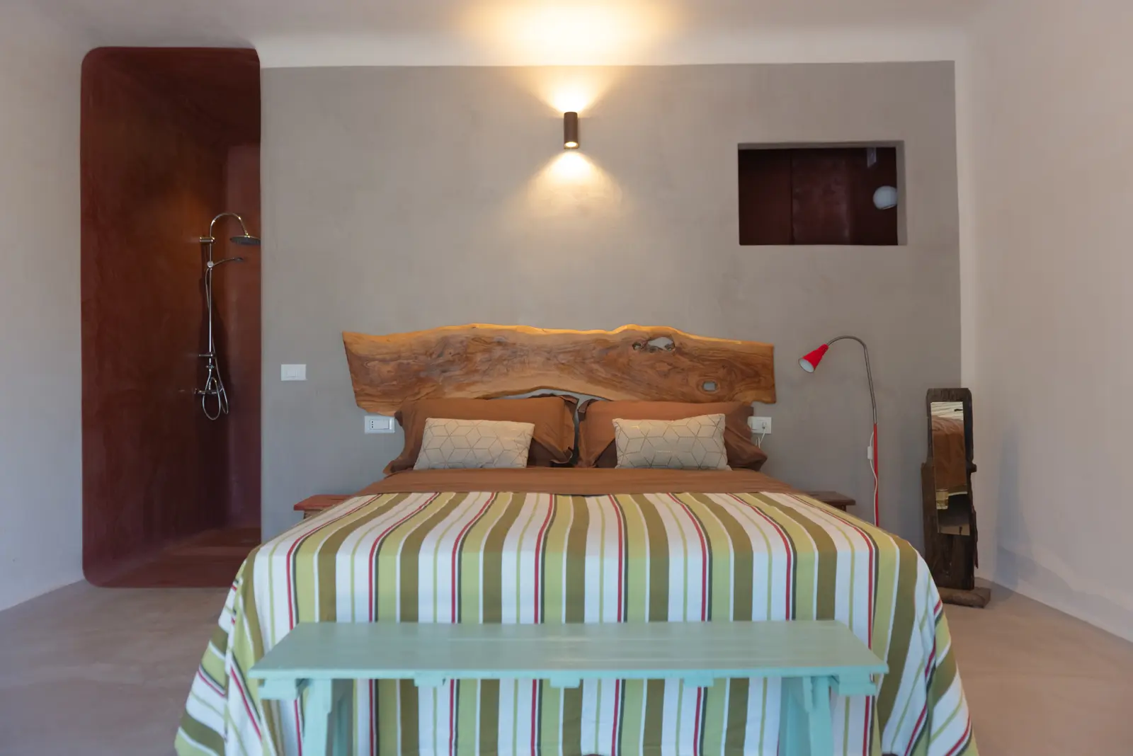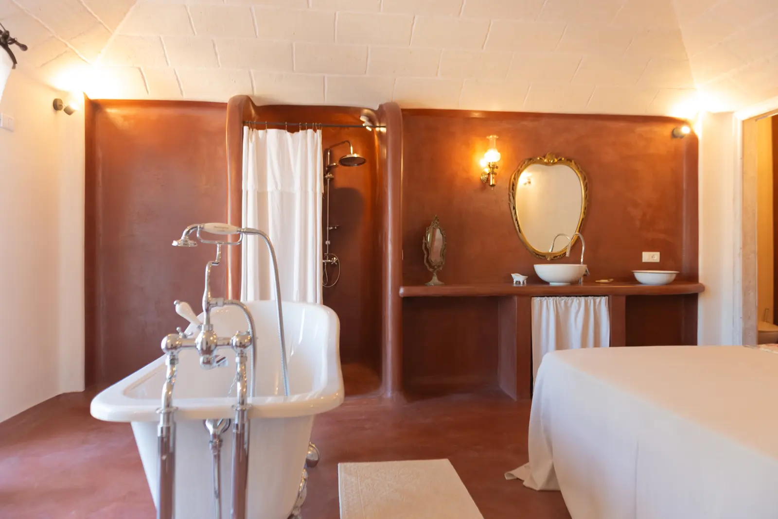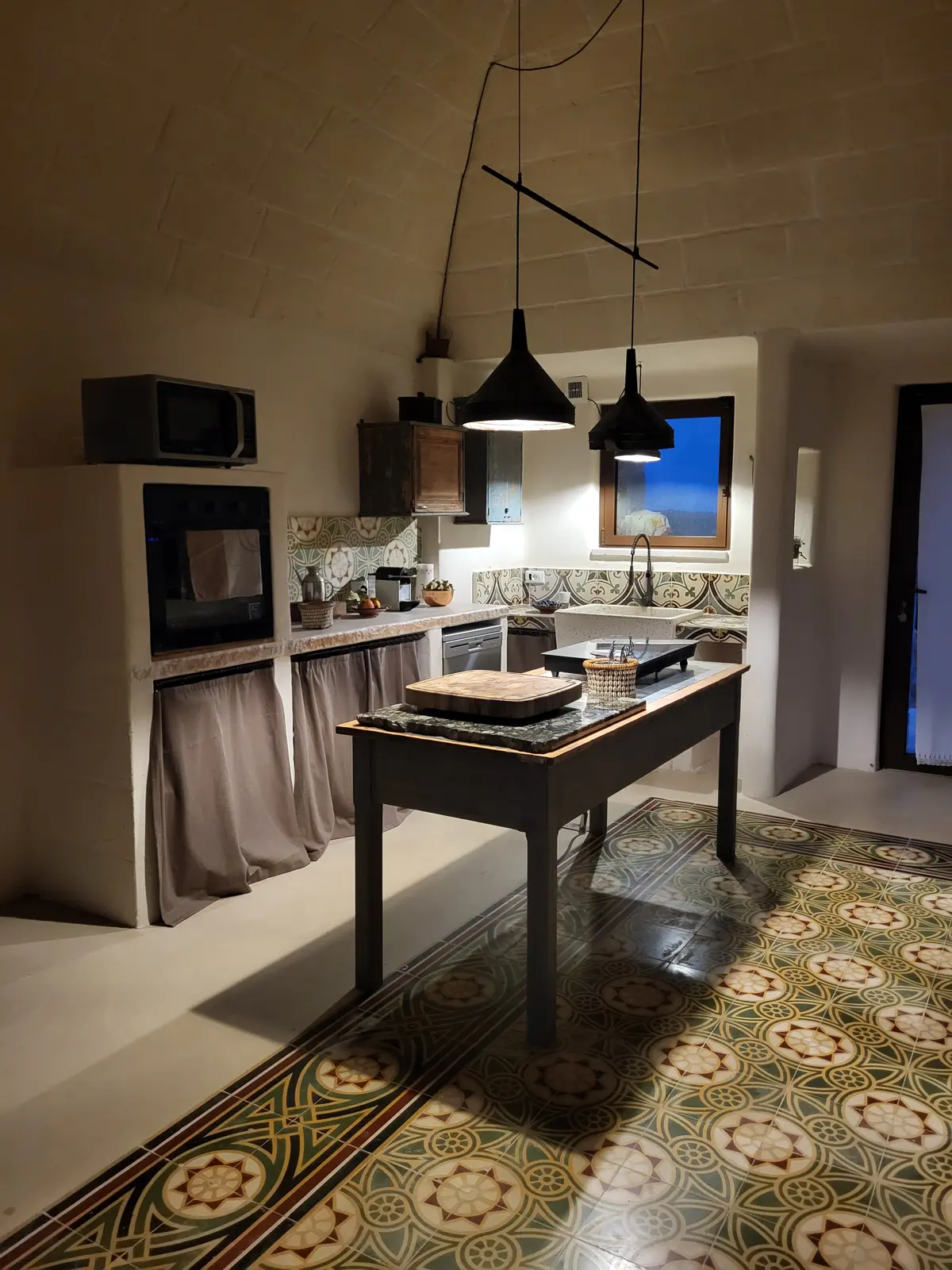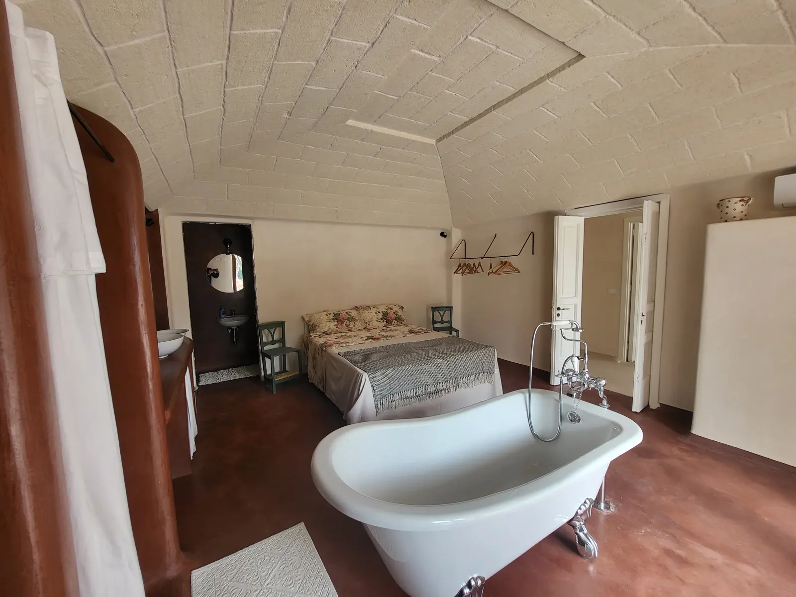 La posizione dominante e la realizzazione della struttura con colori e materiali locali di pietra calcarea, fanno da piacevole contrasto alla terra rossa del territorio ed al verde che la circonda e godere della vista del sole dall’alba e al tramonto.