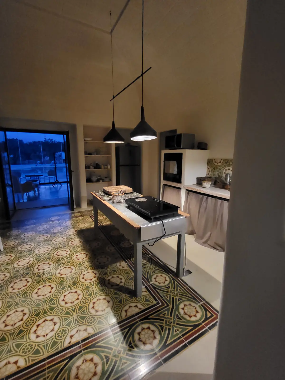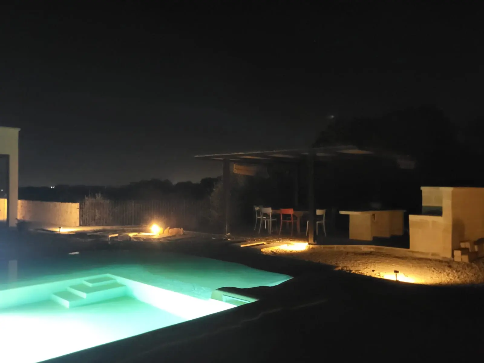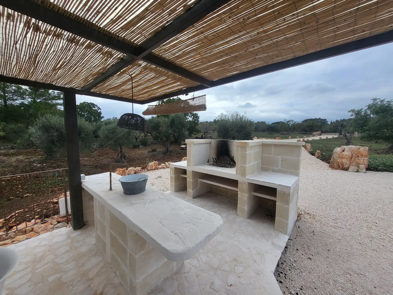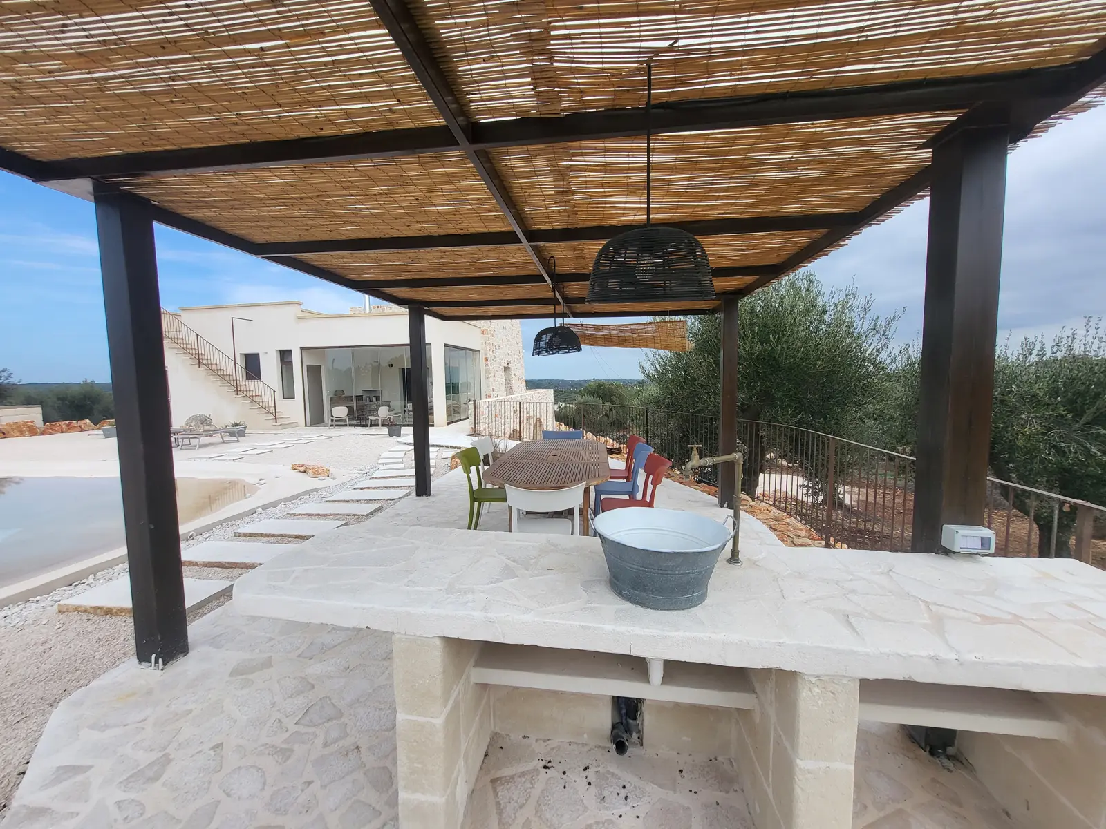 L’area esterna accoglie un pergolato con il suo tavolo e zona “cucina” con bancone lavello e bbq il tutto con vista Ostuni.